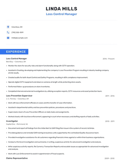 Build a professional loss control manager resume in minutes. Browse through our resume examples to identify the best way to word your resume. Then choose from 5+ resume templates to create your loss control manager resume.