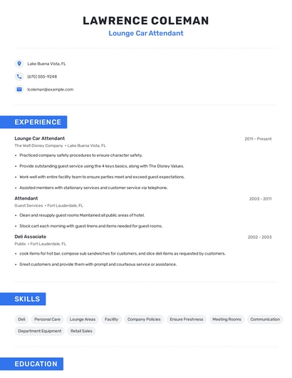 Build a professional lounge car attendant resume in minutes. Browse through our resume examples to identify the best way to word your resume. Then choose from 5+ resume templates to create your lounge car attendant resume.