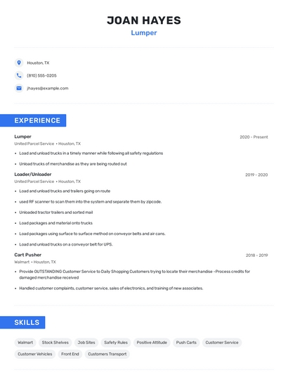 Build a professional lumper resume in minutes. Browse through our resume examples to identify the best way to word your resume. Then choose from 5+ resume templates to create your lumper resume.