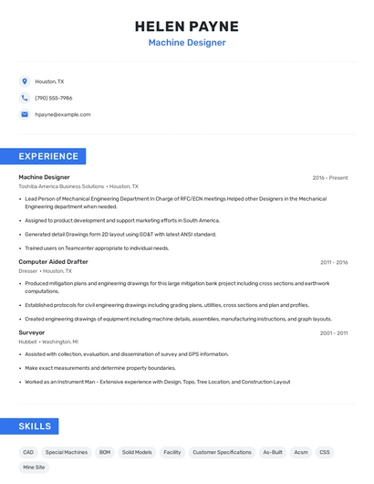Build a professional machine designer resume in minutes. Browse through our resume examples to identify the best way to word your resume. Then choose from 5+ resume templates to create your machine designer resume.