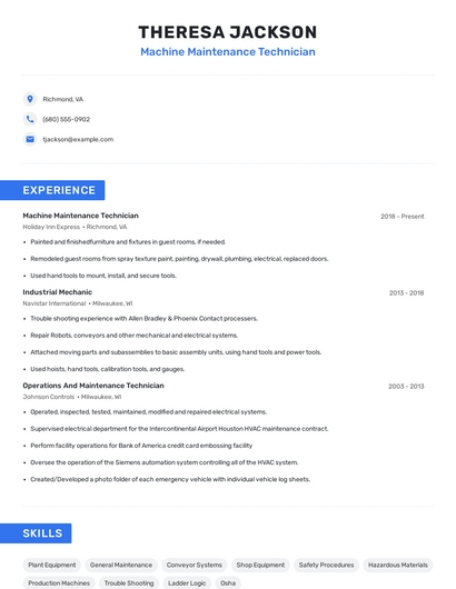 Build a professional machine maintenance technician resume in minutes. Browse through our resume examples to identify the best way to word your resume. Then choose from 5+ resume templates to create your machine maintenance technician resume.