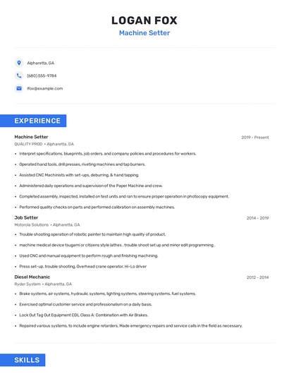 Build a professional machine setter resume in minutes. Browse through our resume examples to identify the best way to word your resume. Then choose from 5+ resume templates to create your machine setter resume.