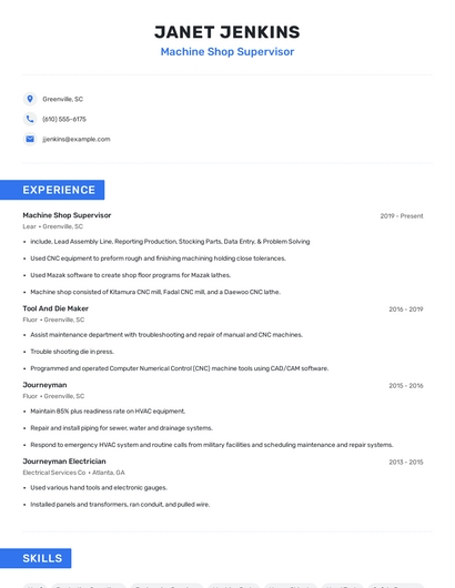 Build a professional machine shop supervisor resume in minutes. Browse through our resume examples to identify the best way to word your resume. Then choose from 5+ resume templates to create your machine shop supervisor resume.