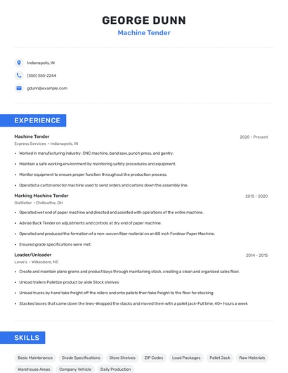 Build a professional machine tender resume in minutes. Our AI resume writing assistant will guide you through every step of the process, and you can choose from 10+ resume templates to create your machine tender resume.7. Oiling