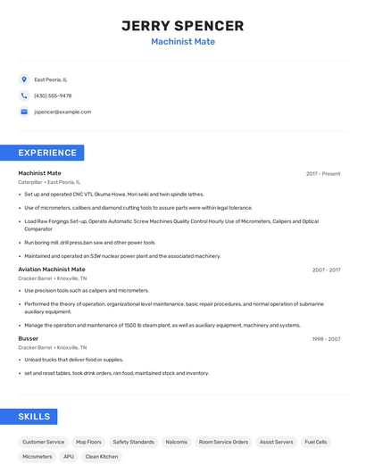 Build a professional machinist mate resume in minutes. Browse through our resume examples to identify the best way to word your resume. Then choose from 5+ resume templates to create your machinist mate resume.