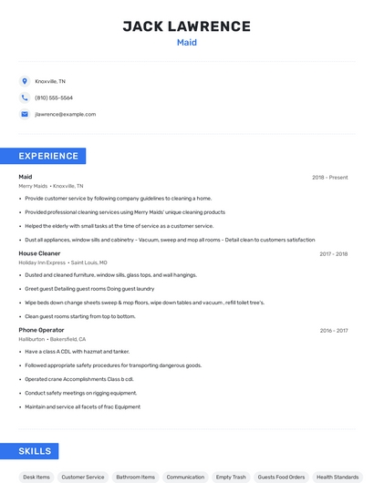 Build a professional maid resume in minutes. Browse through our resume examples to identify the best way to word your resume. Then choose from 5+ resume templates to create your maid resume.
