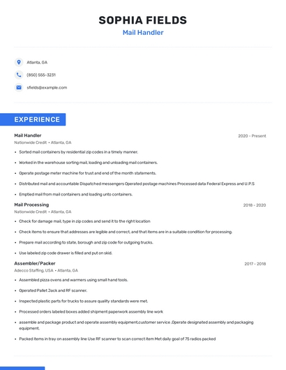 Build a professional mail handler resume in minutes. Browse through our resume examples to identify the best way to word your resume. Then choose from 5+ resume templates to create your mail handler resume.