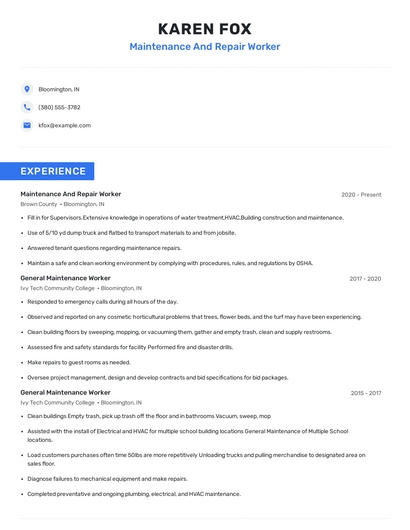 Build a professional maintenance and repair worker resume in minutes. Browse through our resume examples to identify the best way to word your resume. Then choose from 5+ resume templates to create your maintenance and repair worker resume.