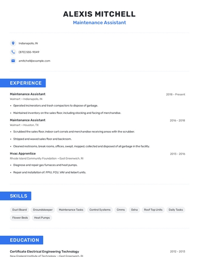Build a professional maintenance assistant resume in minutes. Browse through our resume examples to identify the best way to word your resume. Then choose from 5+ resume templates to create your maintenance assistant resume.