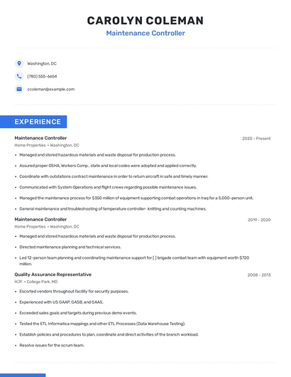 Build a professional maintenance controller resume in minutes. Browse through our resume examples to identify the best way to word your resume. Then choose from 5+ resume templates to create your maintenance controller resume.