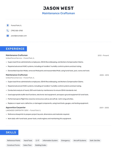 Build a professional maintenance craftsman resume in minutes. Browse through our resume examples to identify the best way to word your resume. Then choose from 5+ resume templates to create your maintenance craftsman resume.
