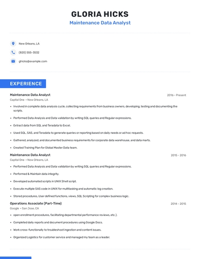 Build a professional maintenance data analyst resume in minutes. Browse through our resume examples to identify the best way to word your resume. Then choose from 5+ resume templates to create your maintenance data analyst resume.