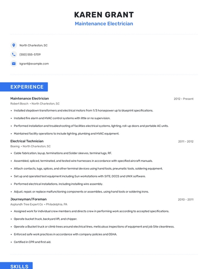 Build a professional maintenance electrician resume in minutes. Browse through our resume examples to identify the best way to word your resume. Then choose from 5+ resume templates to create your maintenance electrician resume.