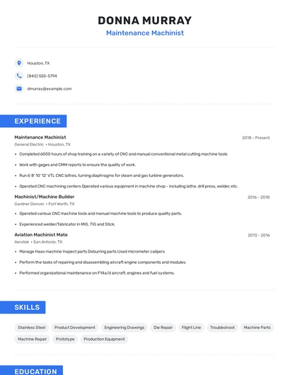 Build a professional maintenance machinist resume in minutes. Browse through our resume examples to identify the best way to word your resume. Then choose from 5+ resume templates to create your maintenance machinist resume.