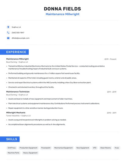 Build a professional maintenance millwright resume in minutes. Browse through our resume examples to identify the best way to word your resume. Then choose from 5+ resume templates to create your maintenance millwright resume.