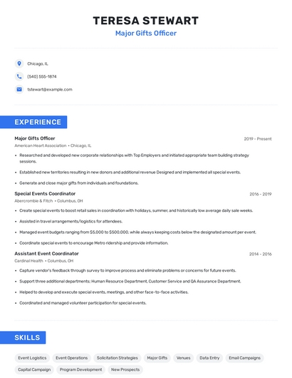 Build a professional major gifts officer resume in minutes. Browse through our resume examples to identify the best way to word your resume. Then choose from 5+ resume templates to create your major gifts officer resume.
