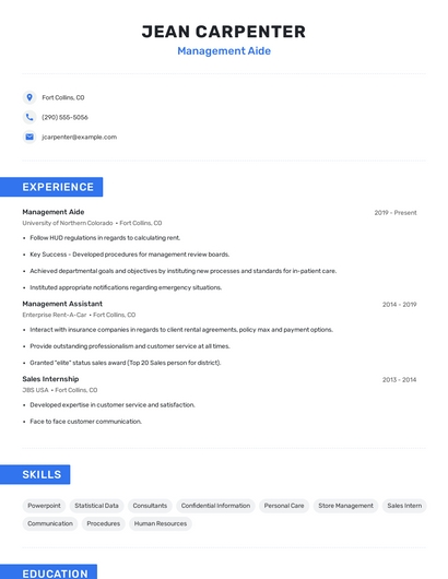 Build a professional management aide resume in minutes. Browse through our resume examples to identify the best way to word your resume. Then choose from 5+ resume templates to create your management aide resume.