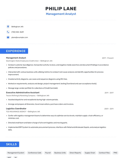 Build a professional management analyst resume in minutes. Browse through our resume examples to identify the best way to word your resume. Then choose from 5+ resume templates to create your management analyst resume.