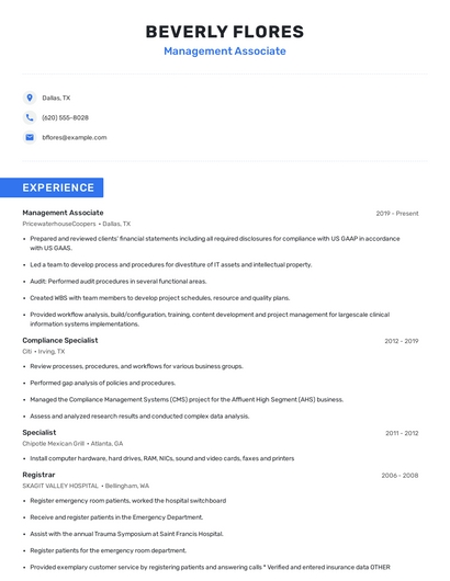 Build a professional management associate resume in minutes. Browse through our resume examples to identify the best way to word your resume. Then choose from 5+ resume templates to create your management associate resume.