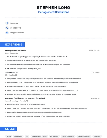 Build a professional management consultant resume in minutes. Browse through our resume examples to identify the best way to word your resume. Then choose from 5+ resume templates to create your management consultant resume.
