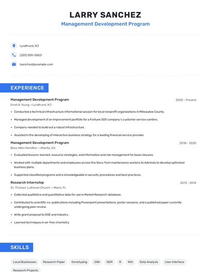 Build a professional management development program resume in minutes. Browse through our resume examples to identify the best way to word your resume. Then choose from 5+ resume templates to create your management development program resume.