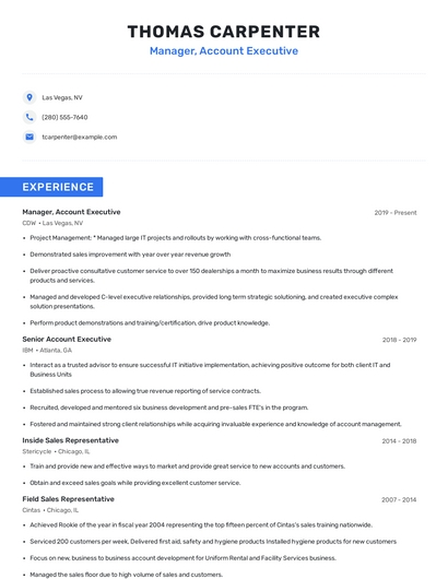 Build a professional manager, account executive resume in minutes. Browse through our resume examples to identify the best way to word your resume. Then choose from 5+ resume templates to create your manager, account executive resume.