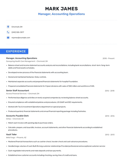 Build a professional manager, accounting operations resume in minutes. Browse through our resume examples to identify the best way to word your resume. Then choose from 5+ resume templates to create your manager, accounting operations resume.