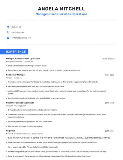 Build a professional manager, client services operations resume in minutes. Browse through our resume examples to identify the best way to word your resume. Then choose from 5+ resume templates to create your manager, client services operations resume.