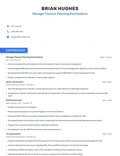 Build a professional manager finance planning and analysis resume in minutes. Browse through our resume examples to identify the best way to word your resume. Then choose from 5+ resume templates to create your manager finance planning and analysis resume.