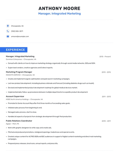 Build a professional manager, integrated marketing resume in minutes. Browse through our resume examples to identify the best way to word your resume. Then choose from 5+ resume templates to create your manager, integrated marketing resume.