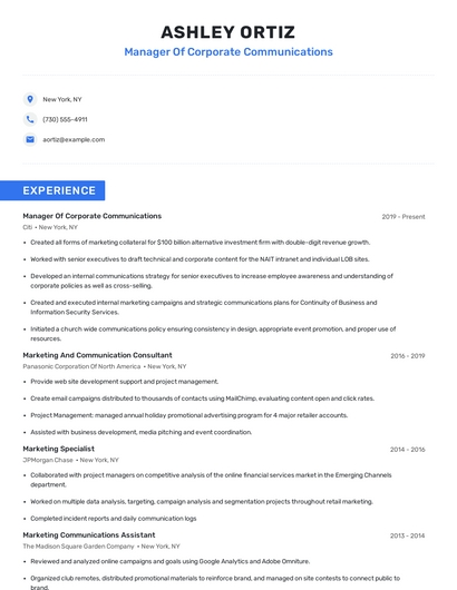 Build a professional manager of corporate communications resume in minutes. Browse through our resume examples to identify the best way to word your resume. Then choose from 5+ resume templates to create your manager of corporate communications resume.