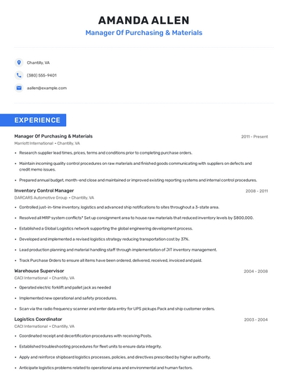 Build a professional manager of purchasing & materials resume in minutes. Browse through our resume examples to identify the best way to word your resume. Then choose from 5+ resume templates to create your manager of purchasing & materials resume.