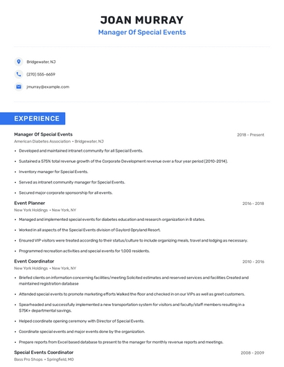 Build a professional manager of special events resume in minutes. Browse through our resume examples to identify the best way to word your resume. Then choose from 5+ resume templates to create your manager of special events resume.