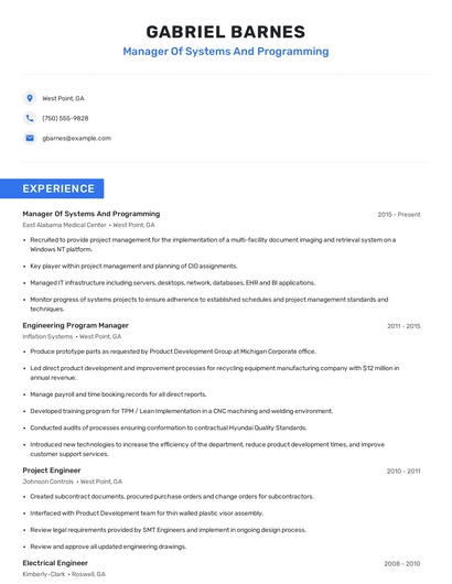 Build a professional manager of systems and programming resume in minutes. Browse through our resume examples to identify the best way to word your resume. Then choose from 5+ resume templates to create your manager of systems and programming resume.