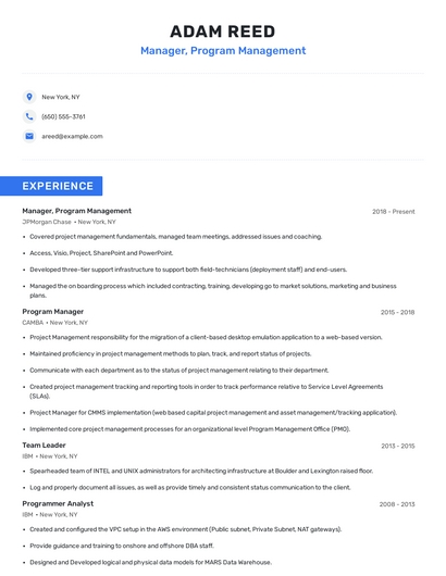 Build a professional manager, program management resume in minutes. Browse through our resume examples to identify the best way to word your resume. Then choose from 5+ resume templates to create your manager, program management resume.