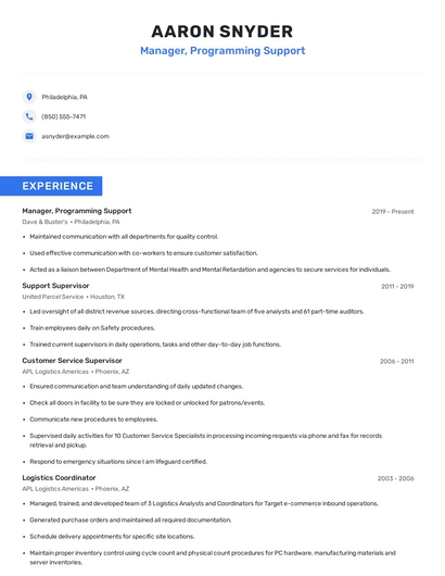 Build a professional manager, programming support resume in minutes. Browse through our resume examples to identify the best way to word your resume. Then choose from 5+ resume templates to create your manager, programming support resume.