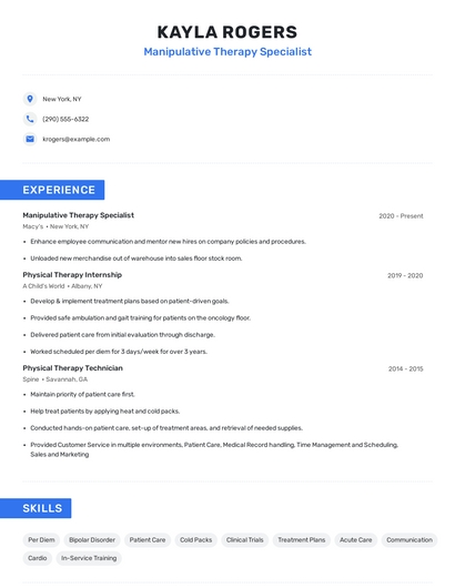Build a professional manipulative therapy specialist resume in minutes. Browse through our resume examples to identify the best way to word your resume. Then choose from 5+ resume templates to create your manipulative therapy specialist resume.