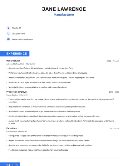Build a professional manufacturer resume in minutes. Browse through our resume examples to identify the best way to word your resume. Then choose from 5+ resume templates to create your manufacturer resume.