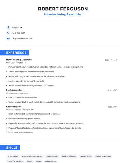 Build a professional manufacturing assembler resume in minutes. Browse through our resume examples to identify the best way to word your resume. Then choose from 5+ resume templates to create your manufacturing assembler resume.