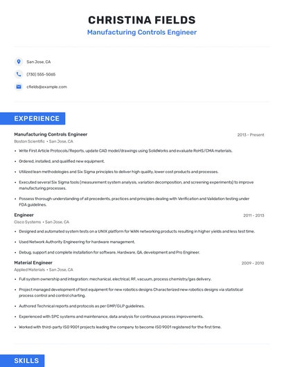 Build a professional manufacturing controls engineer resume in minutes. Browse through our resume examples to identify the best way to word your resume. Then choose from 5+ resume templates to create your manufacturing controls engineer resume.