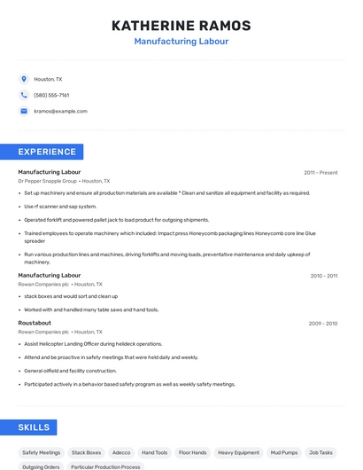 Build a professional manufacturing labour resume in minutes. Browse through our resume examples to identify the best way to word your resume. Then choose from 5+ resume templates to create your manufacturing labour resume.