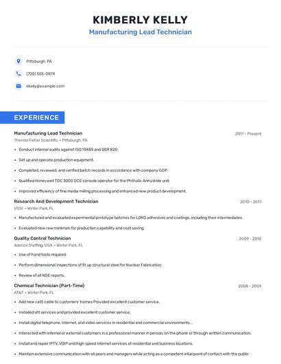 Build a professional manufacturing lead technician resume in minutes. Browse through our resume examples to identify the best way to word your resume. Then choose from 5+ resume templates to create your manufacturing lead technician resume.