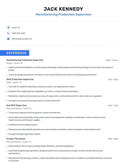 Build a professional manufacturing production supervisor resume in minutes. Browse through our resume examples to identify the best way to word your resume. Then choose from 5+ resume templates to create your manufacturing production supervisor resume.