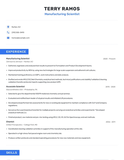 Build a professional manufacturing scientist resume in minutes. Browse through our resume examples to identify the best way to word your resume. Then choose from 5+ resume templates to create your manufacturing scientist resume.