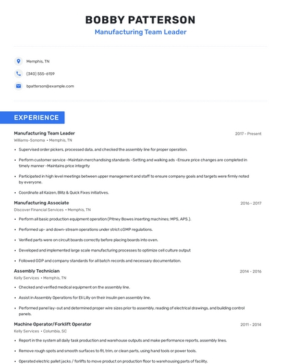 Build a professional manufacturing team leader resume in minutes. Browse through our resume examples to identify the best way to word your resume. Then choose from 5+ resume templates to create your manufacturing team leader resume.