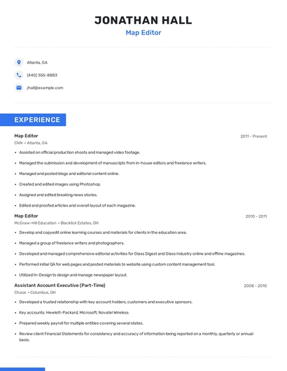 Build a professional map editor resume in minutes. Our AI resume writing assistant will guide you through every step of the process, and you can choose from 10+ resume templates to create your map editor resume.What skills help Map Editors find jobs?