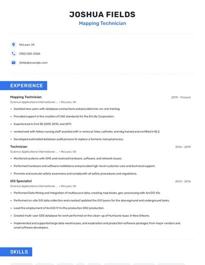 Build a professional mapping technician resume in minutes. Browse through our resume examples to identify the best way to word your resume. Then choose from 5+ resume templates to create your mapping technician resume.