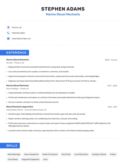 Build a professional marine diesel mechanic resume in minutes. Our AI resume writing assistant will guide you through every step of the process, and you can choose from 10+ resume templates to create your marine diesel mechanic resume.7. Mechanical Equipment