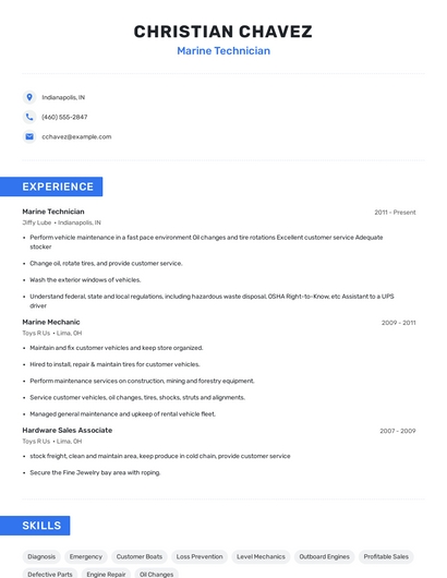 Build a professional marine technician resume in minutes. Browse through our resume examples to identify the best way to word your resume. Then choose from 5+ resume templates to create your marine technician resume.