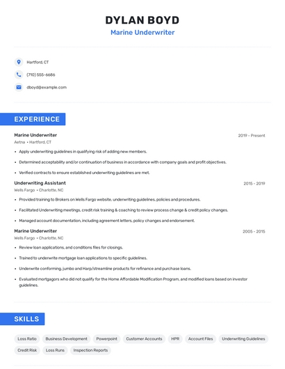 Build a professional marine underwriter resume in minutes. Our AI resume writing assistant will guide you through every step of the process, and you can choose from 10+ resume templates to create your marine underwriter resume.7. Property Business